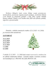 Rezervácie v rámci obdobia 22.12.2025-6.1.2026 sú možné len na základe telefonickej dohody t.č.0948 983 462 alebo 0948 854 440.