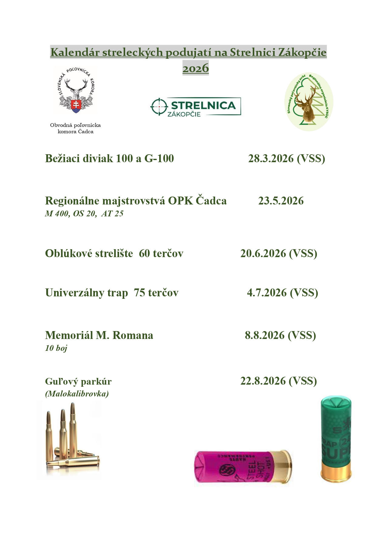 Priatelia v priloženom odkaze nižšie nájdete aktualizovaný kalendár streleckých podujatí 2026, organizovaných SPZ RgO Kysúc a OPK Čadca na Strelnici Zákopčie